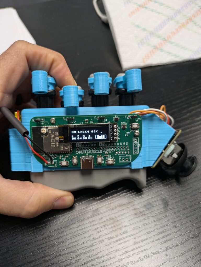 LASK4 v2.0 used four spring-loaded pistons with Hall effect sensors to measure individual finger curl force. Data was transmitted over UDP alongside timestamps for synchronization with the forearm sensor band.