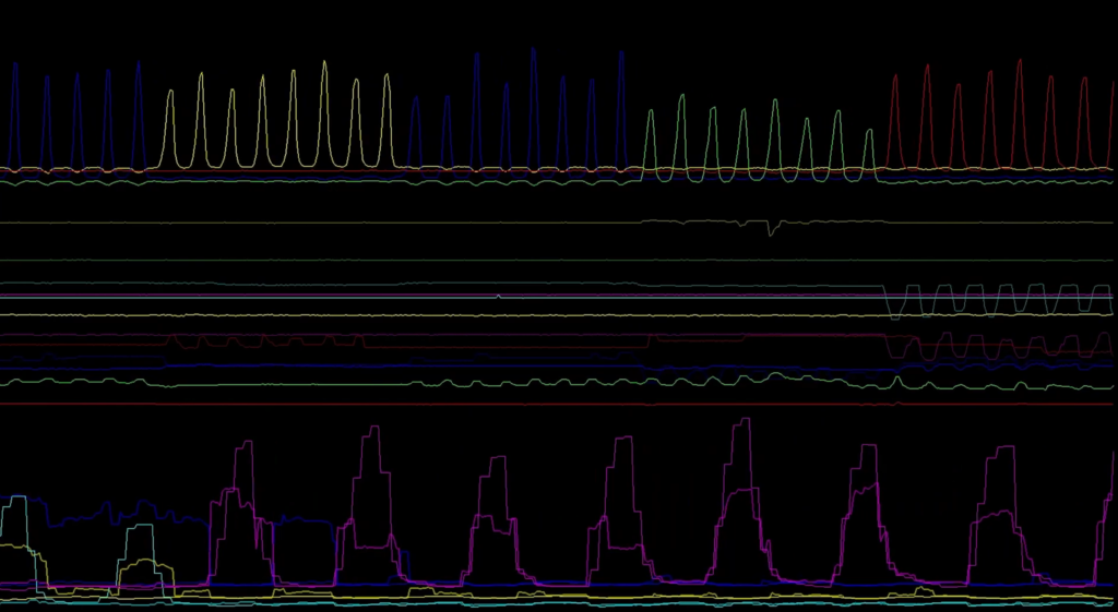 The trained model runs in real-time on a host computer, receiving UDP sensor data and outputting per-finger force predictions. The system achieves low enough latency for interactive use. The visualization below shows the FlexGrid sensor with real LASK finger values in blue and predicted values in orange.